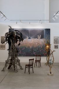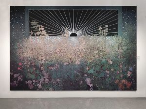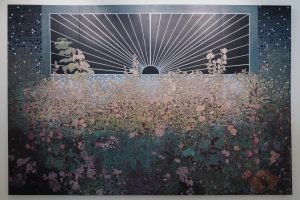 Верх — тёмный балкон, словно закопчённый временем или растворённый в космической пустоте, застывший за серебряной решёткой. Низ — светлый палисадник, полный буйных красок и движения.