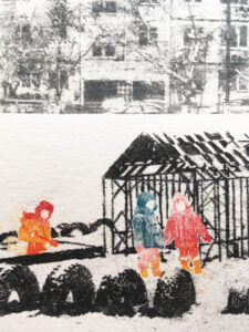 ПАТТЕРНЫ ПОВСЕДНЕВНОСТИ − серия графических работ. Каждая работа заключает в себе один из архетипических образов повседневности панельного квартала. Образы конструировались посредством совмещения рисунков, натурных съемок и фотографий из личного семейного архива автора и были объединены с помощью техник печатной графики. (бумажная литография, монотипия, линогравюра, диатипия)