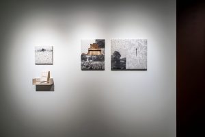 синтепон, найденный деревянный объект, лен, холст на подрамнике, типографские краски