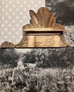 Объект, ставший частью работы я обнаружила в кухонной зоне «темной» избы. Мне не удалось точно выяснить, частью чего была эта вещь. К зеркалу, которое мы тогда же забрали из дома, она не подходит. Оставляя простор для размышлений, вещь приобрела новый смысл переродившись в произведении искусства.